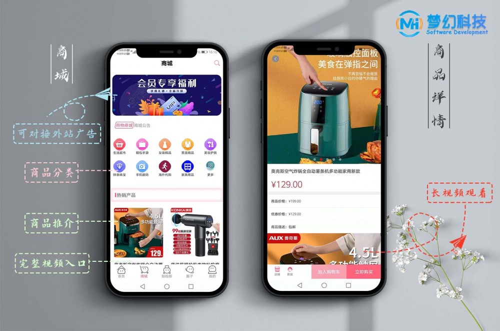 商城:可对接外展广告、商品分类、商品推介、完整视频入口