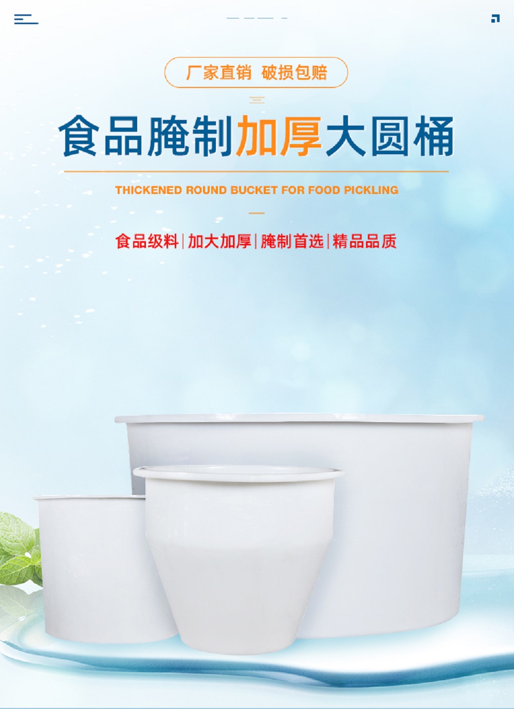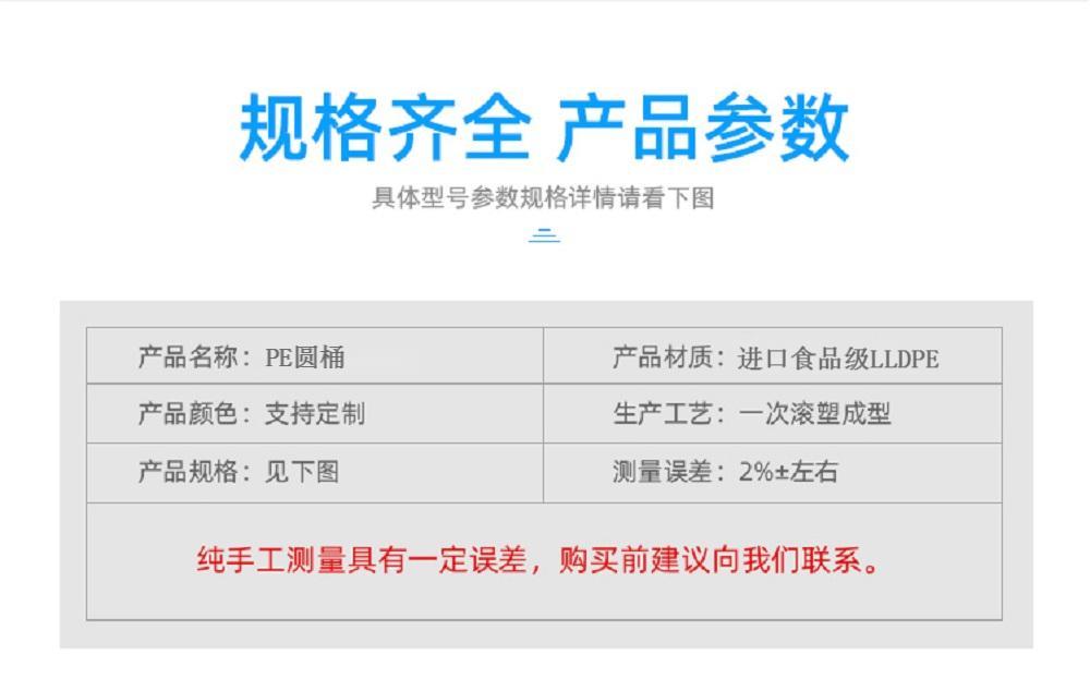 PE圆桶,敞口圆桶,根据其用途命名也叫食品腌制桶,皮蛋腌制桶,竹笋腌制桶,泡椒桶,泡菜桶,清洗桶,棉条桶,漂染桶,水产品专业桶,发酵桶。