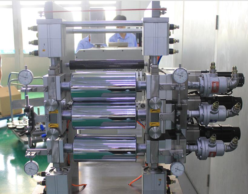 (3)三辊采用立式布置,独立驱动,中辊固定,上下辊可以上下移动,采用气缸压紧,有微调装置,有效保证片材厚度尺寸精度。