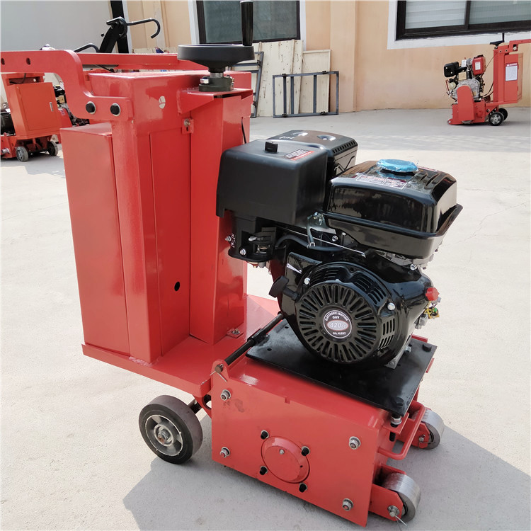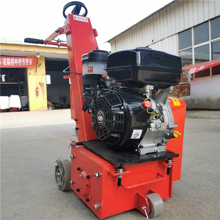 采用与大型铣刨机的反切削相反工作原理,小型铣刨机是依靠铣鼓的正向高速旋转,从而甩动铣鼓刀轴上的几组硬质钨钢合金刀片高速敲击地面,利用合金刀片上的钨钢合金齿来破碎与磨削地面材料,从而达到表面铣刨处理效果