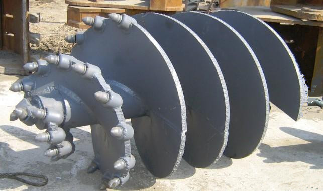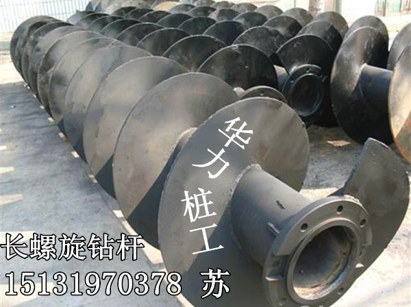 长螺旋钻具由螺旋钻头和螺旋钻杆组成,长螺旋钻具的钻杆全部被连续的螺旋叶片覆盖,切削土层时被切土削或是沿叶片斜面向上滑行,或是沿叶片斜面成球状向上滚动逐渐从螺旋钻机出土槽中排出,圆钻杆可为单壁钻杆也可为双壁钻杆,双壁钻杆可在钻进时一边钻进一边输送空气以减少回转阻力。长螺旋钻具一般口径不大于¢800mm,对于进口大型钻机配套长螺旋钻具,螺旋钻杆口径大可达¢2500mm。本产品钢体选用经过热处理高强度合金钢,保持高强韧形和高耐磨性;为增强使用寿命,加涂耐磨层。尤其是在南方较硬地层和卵石层比较多,钻杆普遍寿命比较短,叶片出现坍塌,变形等情况。钻杆根据不同地层做了具体改进。
