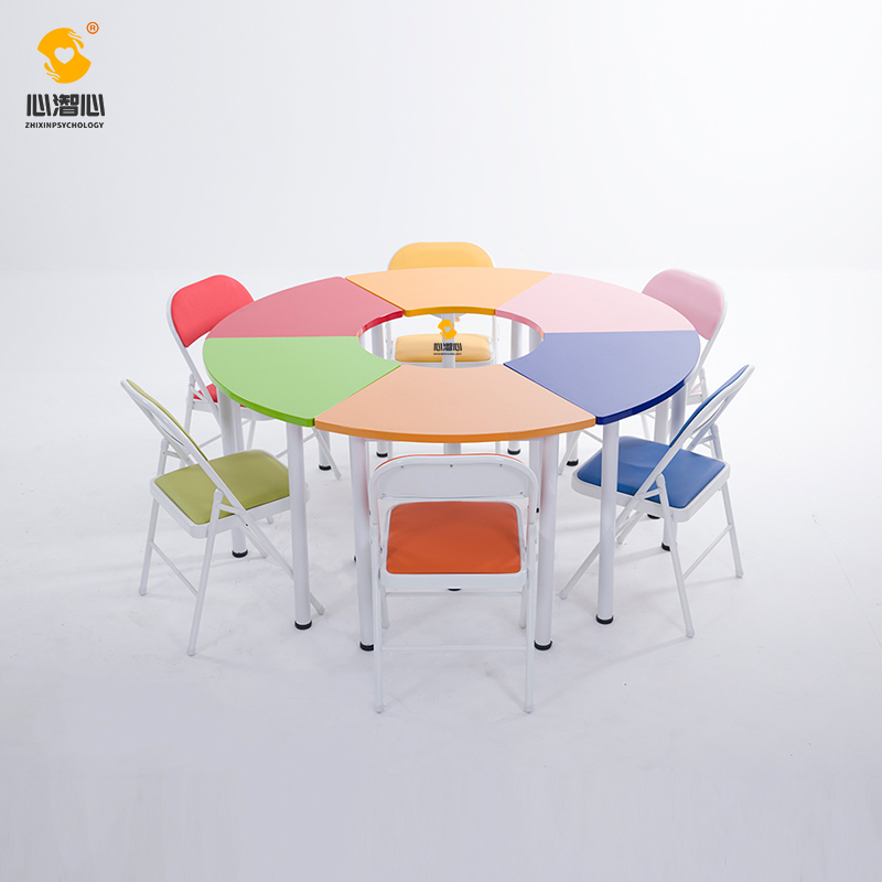 团体活动桌椅根据团体活动需要,组合成圆形、扇形、方形、S形、C形、X形等十几种组合方式,每套适合6人开展团体活动。是团体活动室器材之一,可以根据活动需要组合成多种方式。