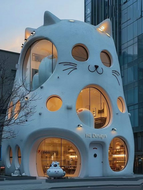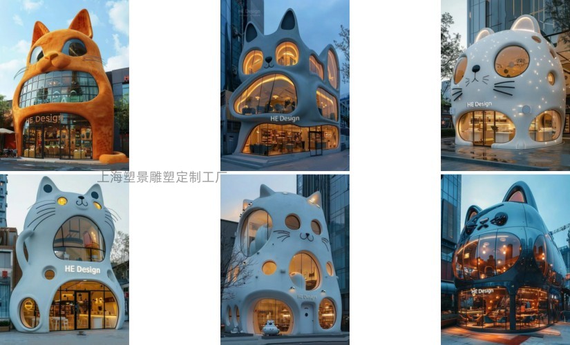 波斯猫建筑雕塑以猫咪的卡爱形象做造型,猫脊背为实体建筑成为整个建筑的承重、猫眼为窗、猫腹为门,配上猫鼻和长长的猫须,让猫咪的表情丰富多样,在城市广场夜晚的灯光开启中,明亮而夺目,是商业建筑的核心,专卖店展示作品的好选择。
