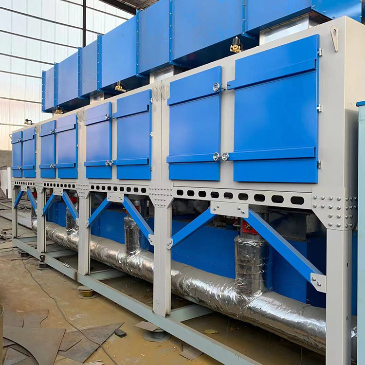 活性炭使用一段时间,吸附了一定量的溶剂后,会降低或失去吸附能力,此时活性炭需脱附再生,再生后活性炭重新恢复吸附功能可继续使用。再生时,启动催化燃烧装置予热室电源,将空气予热,予热后的气体送入吸附箱,箱中活性炭受热后,活性炭吸附的溶剂挥发出来,溶剂经风机送入催化燃烧室燃烧,燃烧后分解生成CO2和H2O蒸汽等热空气,热空气一部分回到活性炭吸附箱继续给活性炭加热,叧一部分排空,热空气内部循环多次活性碳即可得到再生。