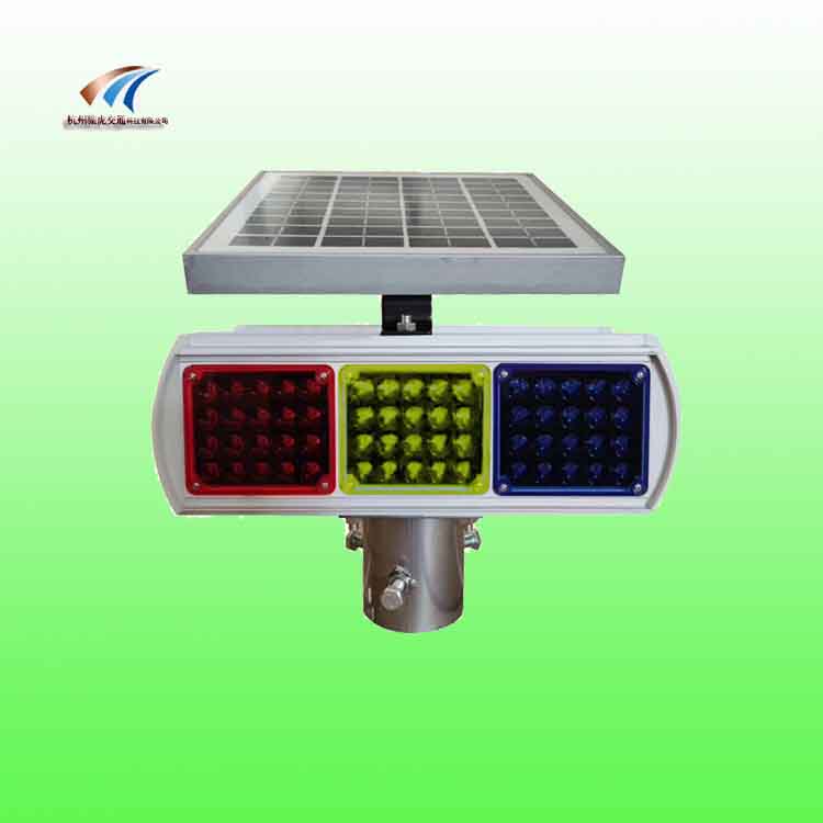太阳能三灯爆闪灯特点:外壳由经氧化处理的铝型材组合,表面塑料喷漆,外观精美,长时间使用并不会出现锈迹斑斑,闪灯采用密封结构组合式灯组,每组20个超亮LED,真空镀膜反光板,亮度高,警示效果好,聚碳酸酯灯罩,抗冲击,耐老化,整灯的密封密封效果好,有很好的防水性,并配有过充电过放电保护功能。