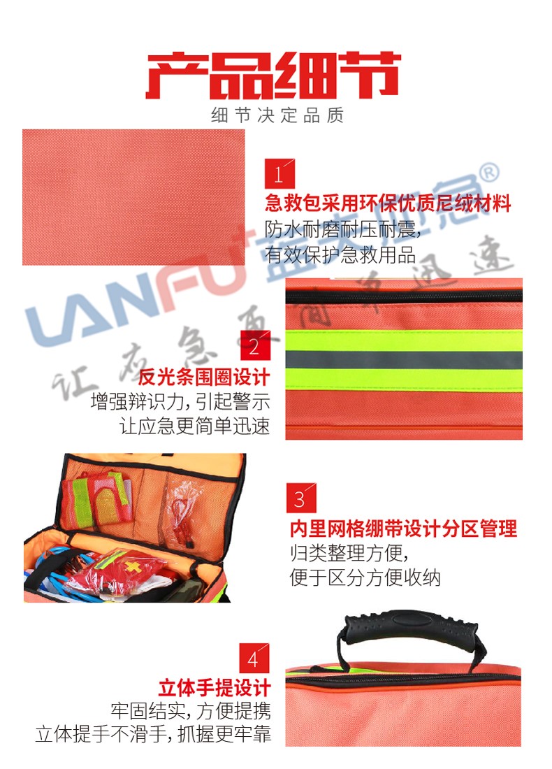 产品特点:采用环保优质尼绒材料、防水耐磨、耐压耐震、有效保护急救用品。大包围反光条设计,增强辨识力,起到警示作用,提高识别度;内里网格绷带设计分区管理,归类整理方便,便于区分方便收纳,立体提手设计,牢固结实,方便提携,立体提手防手滑,抓握更牢靠。