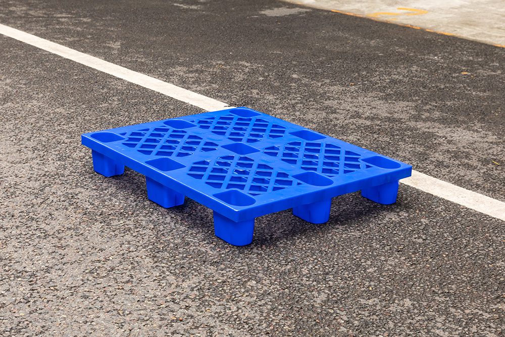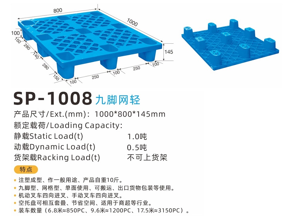 1008九脚网格塑料托盘,是一种尺寸为1000*800*145mm,底部为九脚,面板为网格状的塑料托盘。四向进叉,适用于各类叉车。采用HDPE为原料,一次注塑成型,结构稳定,广泛应用于物流运输,仓储服务等各种场合。