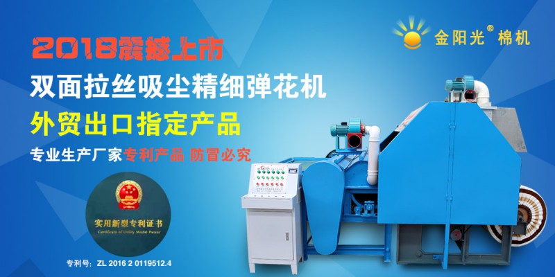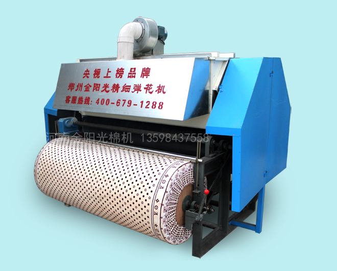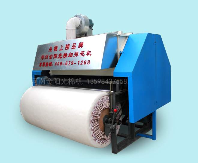3、多功能精细弹花机:本机共有九道刺辊,可梳理棉花、丝棉、化纤、毛线、PP棉、羊毛、驼绒等多种原料,经本机九道刺辊的梳理后,由斩刀剥离后卷上木桶即成被胎、弹性好拉力强,是做无网被胎的。可做太空被、踏花被、九孔被等。