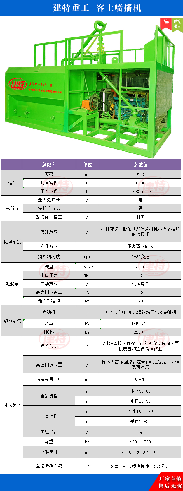 JKP-喷播机系列产品是建特重工经过数年的研发,结合市场需求,推出的一种结合喷播和免灌两种技术而成的新型绿化设备,通过本设备将土壤基质、绿化草籽、保水剂、黏合剂、肥料等,在喷播机搅拌罐中与水混合成胶状的浆液,用泥浆泵将其喷播于坡面上。由于浆液中含有保水材料、黏合材料、各种养分,在保证了植物生长所需的水和其它营养物质来源的同时有效防止雨水冲刷对喷播材料的破坏,故而植物能够健康、迅速地成长。采取喷播机喷播现已成为高速公(铁)路边坡绿化、矿山复绿、荒漠治理、河堤防护、大规模绿地重建等绿化工程中行之有效方法。
