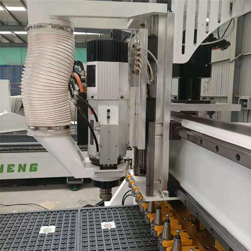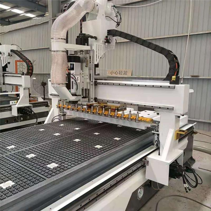直排换刀加工中心作为一款经济型的门板加工设备,在市场应用比较广泛。直排换刀加工中心,顾名思义是刀库是固定的一排,速调跟随式直排换刀可以跟随龙门进行移动,换刀速度快,导轨磨损度小,节省时间。