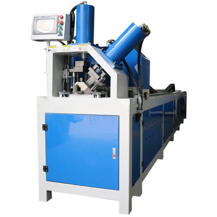全自动数控角钢法兰生产线,又名数控角铁生产线,主要完成风管角钢法兰(30-50角钢)的大小孔的冲孔及切断功能,实现自动送料、打孔、切断全自动数控控制要求,节约人