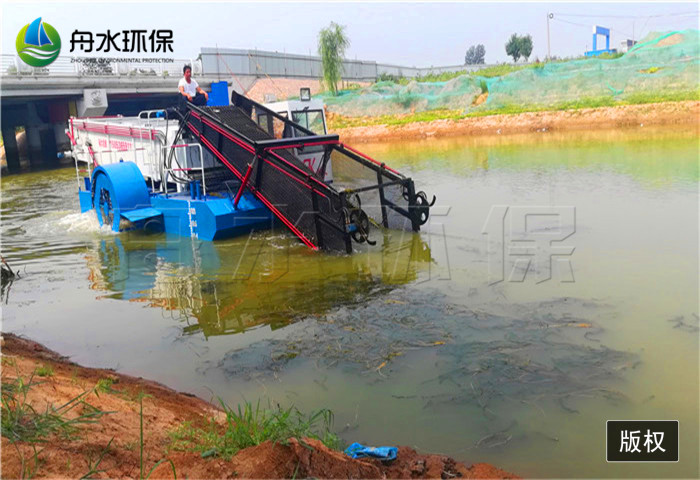 舟水全自动水草收割船能有效的收集湖面、河道、人工湖水域丛生的水草及水面漂浮物,所有机械联动采用全液压驱动,明轮、割台、收割器和输送链可连续工作,仅需一人操作.全自动割草船装载量打,且在水域能够原地回转,大大减少了低头距离,并加装夜间作业照明系统,能配合紧急任务的夜间作业要求,仅需一人操作。