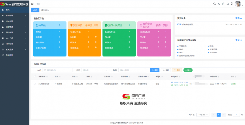 目前大多预约仪器需要线下进行,教师在线下对仪器和学生进行管控,极大的增加了教师和学生的工作量,导致管理混乱、学生预约仪器时间冲突、仪器使用率低,仪器使用完毕后仪器是否损坏也不知情等突出问题。依托盛元广通Sass仪器预约管理系统,针对实验预约、仪器使用率、完好率、配备率以及机时时长进行*准统计。