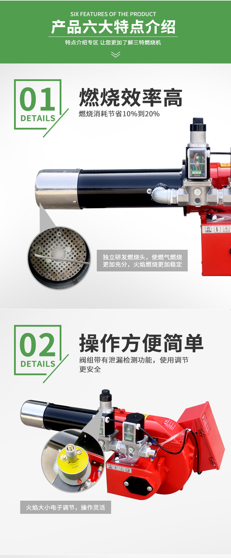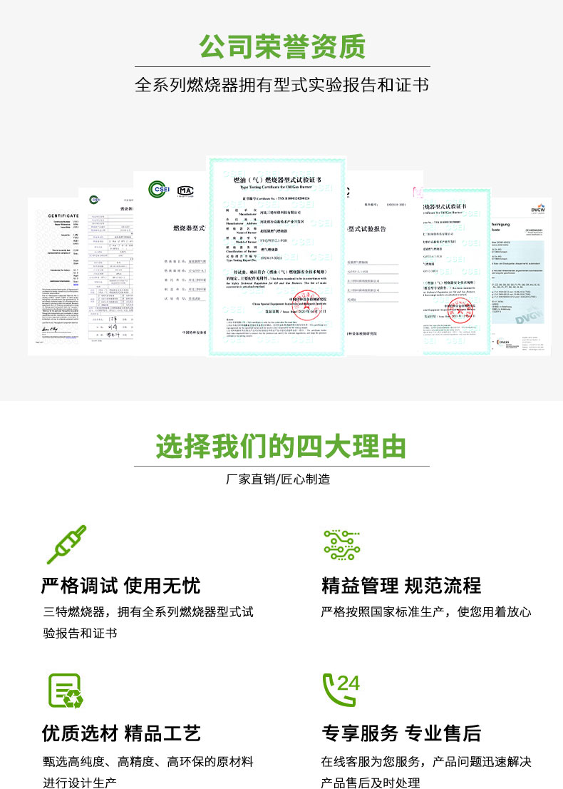 燃气燃烧机以所有可燃性气体为燃料进行燃烧,采用电子比例调节控制方式,热效率高达99.99%,燃烧器发热量可达1800万大卡。利用电子比例燃烧控制方式,准确的空燃配比,具有停电、燃气压力低、空气压力低、燃气泄露监测、二次点火等保护功能。配有专用UV紫外电子眼检测模块对运行状态进行全程监测,实现安全,高效,低成本等特点。