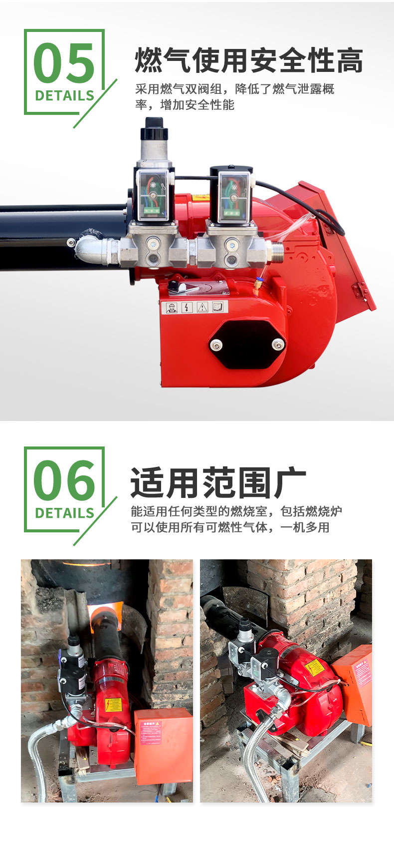 燃气燃烧机以所有可燃性气体为燃料进行燃烧,采用电子比例调节控制方式,热效率高达99.99%,燃烧器发热量可达1800万大卡。利用电子比例燃烧控制方式,准确的空燃配比,具有停电、燃气压力低、空气压力低、燃气泄露监测、二次点火等保护功能。配有专用UV紫外电子眼检测模块对运行状态进行全程监测,实现安全,高效,低成本等特点。