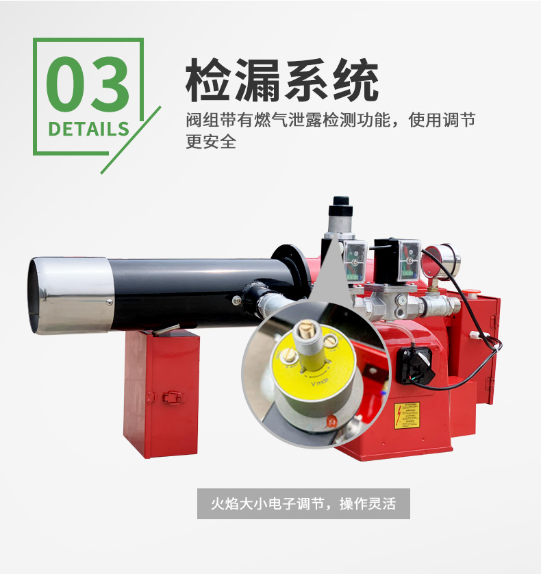 燃气燃烧机以所有可燃性气体为燃料进行燃烧,采用电子比例调节控制方式,热效率高达99.99%,燃烧器发热量可达1800万大卡。利用电子比例燃烧控制方式,准确的空燃配比,具有停电、燃气压力低、空气压力低、燃气泄露监测、二次点火等保护功能。配有专用UV紫外电子眼检测模块对运行状态进行全程监测,实现安全,高效,低成本等特点。