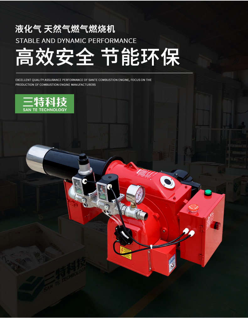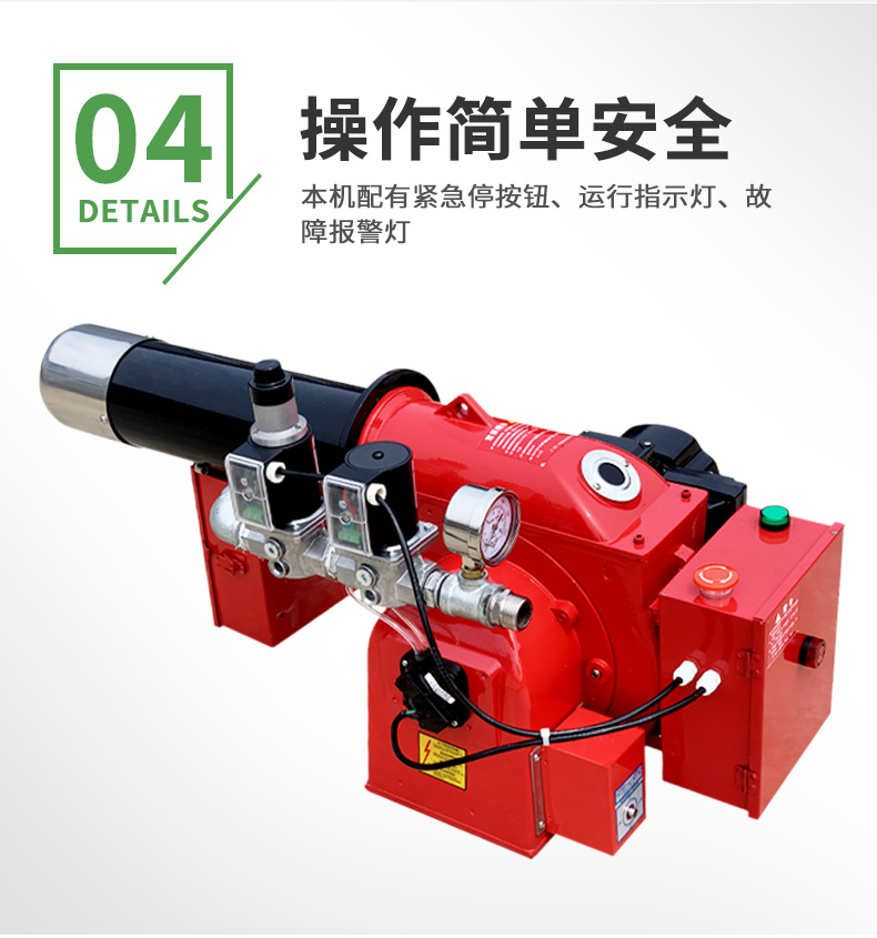 燃气燃烧机以所有可燃性气体为燃料进行燃烧,采用电子比例调节控制方式,热效率高达99.99%,燃烧器发热量可达1800万大卡。利用电子比例燃烧控制方式,准确的空燃配比,具有停电、燃气压力低、空气压力低、燃气泄露监测、二次点火等保护功能。配有专用UV紫外电子眼检测模块对运行状态进行全程监测,实现安全,高效,低成本等特点。
