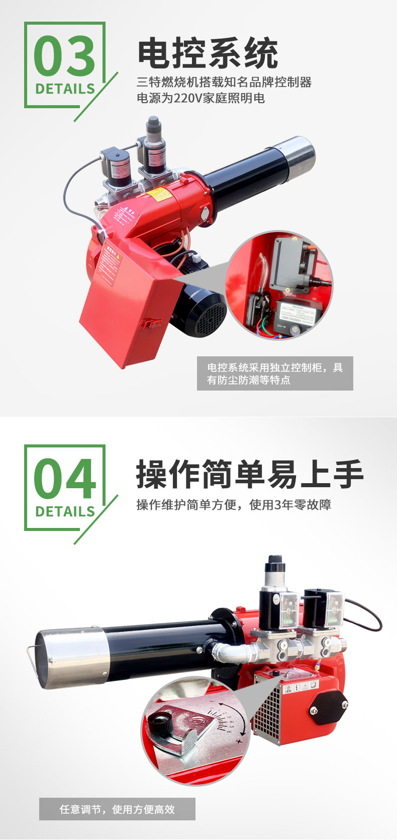 燃气燃烧机以所有可燃性气体为燃料进行燃烧,采用电子比例调节控制方式,热效率高达99.99%,燃烧器发热量可达1800万大卡。利用电子比例燃烧控制方式,准确的空燃配比,具有停电、燃气压力低、空气压力低、燃气泄露监测、二次点火等保护功能。配有专用UV紫外电子眼检测模块对运行状态进行全程监测,实现安全,高效,低成本等特点。