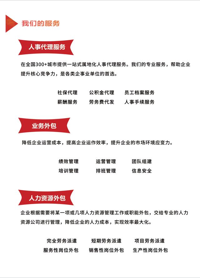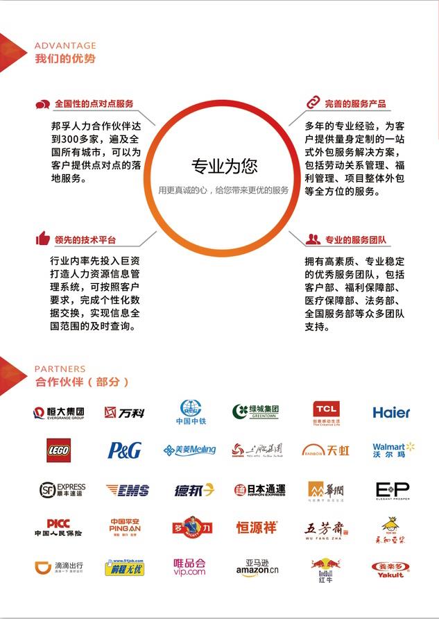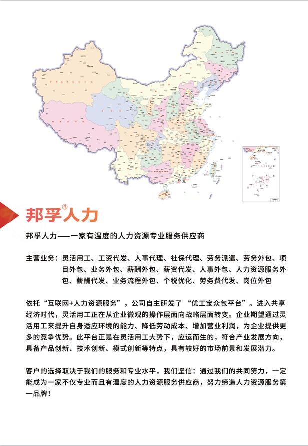 邦孚人力坚持专注人力资源服务,成立至今先后为上万家企业提供优质的人力资源服务,已在业界赢得了良好的。并且荣获诚信企业、中介、服务外包重点培育单位等的授信和表彰。公司对外服务范围:“工资代发、人事代理、五险一金代理、人力资源、、劳务外包、项目外包、业务外包、灵活用工、薪酬外包、薪资代发、人事外包、人力资源服务外包、薪酬代发、业务流程外包、个税优化、劳务费代发、岗位外包”等。目前与邦孚人力建立人事外包合作客户近万家,雇员数十万人。人力资源服务覆盖了人员招聘、面试、测评、培训、体检、档案整理、工资、社保、合同、辞职及其他服务。