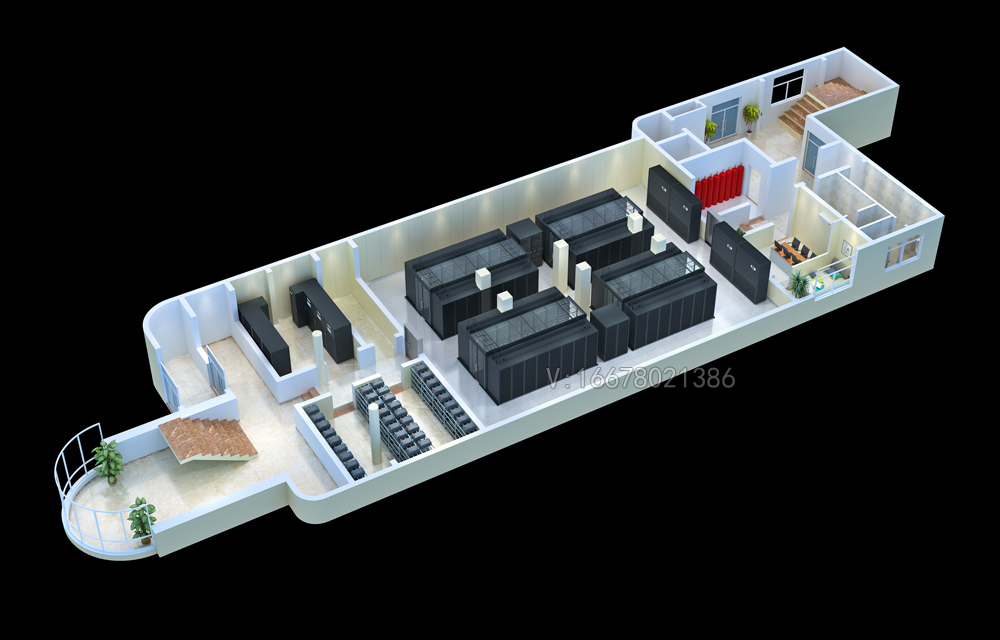 上海模块化机房动环规划整体鸟瞰图制作,立体机房,数据中心拼接屏,或者称之为俯视图,全部展现在相机视角内的一种表现方式。有的表现角度为正上方垂直角度,顶视图。着重表现整体的规划设备布局方案。