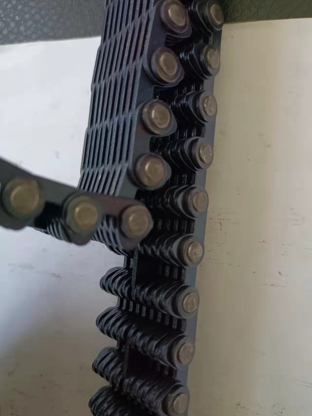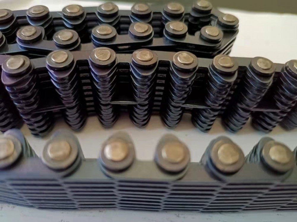 齿形链又称无声链(Silent Chain),属于传动链的一种形式。我国的标准为:GB/T10855-2003《齿形链和链轮》。齿形链是由一系列的齿链板和导板交替装配且销轴或组合的铰接元件连接组成,相邻节距间为铰连节。根据导向型式可分为:外导式齿形链、内导式齿形链和双内导齿形链.齿形链又称无声链,属于传动链的一种形式。齿形链是一种应用广泛的重要机械基础件,主要用在高速、重载、低噪音、大中心距的工况下,其传动性能优于齿形带传动、齿轮传动以及磙子链传动,以成为众多行业对传动形式之一,以啮合形式分可分为内啮合齿形链、外啮合齿形链和内外复合啮合齿形链,其中内外复合啮合齿形链的噪音小,应用也广泛。主要特点:1.噪音小 齿形链是通过工作链板与链轮齿的渐开线齿形进行啮合传递动力,与滚子链和套筒链相比其多边形效应明显降低,冲击小、运动平稳、啮合噪音较小。2.可靠性较高 齿形链的链节是多片式结构,当其中个别链片在工作中遭到破坏时并不影响整根链条的工作,使人们能够及时发现并更换,如需增加承载能力只需在宽度方向较小尺寸(增加链片排数)。3.运动精度高 齿形链各链节磨损伸长均匀,可保持较高的运动精度。齿形链条主要应用范围:齿形链主要应用在纺织机械和无心磨床,传送带机械设备。齿形链条的种类:CL06,CL08,CL10,CL12,CL16,CL20。根据导向分:内导的齿形链条和外导的齿形链条,内外复合的齿形链条