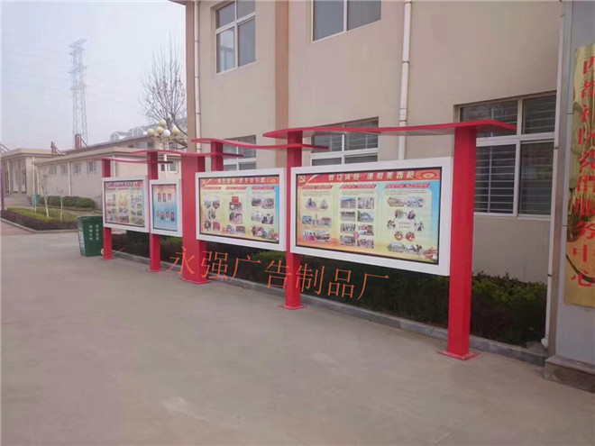 江苏永强宣传栏厂家是专业从事宣传栏的研究、开发、生产的企业,经过多年的技术积累,已形成具有特色的宣传栏系列产品,我们现有宣传栏200余款,形状与规格多样,材质包括金属、钢木、塑料、环保复合材料等,产品品质优异、安全耐用、抗撞击、耐腐蚀、不蛀不裂,不变形,且色泽持久、耐候性好,设计符合人体工程学,诚为现代都市户内外家俱之。 江苏永强宣传栏厂家始终秉持『超群品质,用心服务』的经营理念,严格遵守ISO9001:2000质量管理体系生产标准,注重产品的安全环保与品质的有机结合,特别是与环境的协调,精心选材、严格管理,相信可以为您提供符合二十一世纪城市建设与生活休闲新理念的产品。恭候阁下垂询!您的成功,您的满意,是我们的心愿