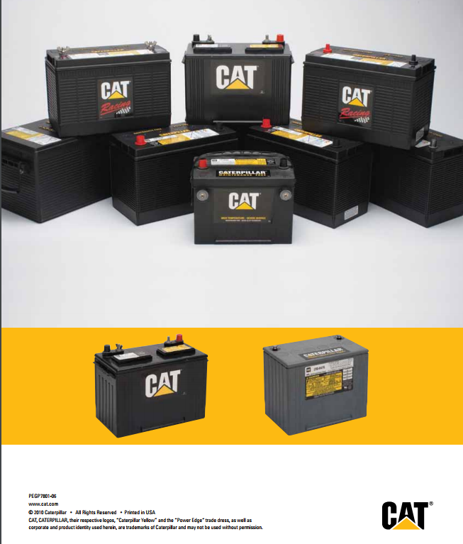 美国CAT蓄电池-卡特电池票【CAT】 卡特优质高输出 (PHO) 蓄电池 卡特蓄电池是所有卡特产品的标准设备,与竞争对手的产品存在显著的差别。 卡特专门设计了自己的蓄电池,以满足卡特产品工作环境的严苛要求。 卡特蓄电池优点: 业内高的冷起动电流 (CCA) 大的安培-小时容量 100 小时振动测试(工业标准的 5 倍) 佳的深度放电-重新充电循环 SAE J2185 寿命周期 可用于免保养和低保养设计 卡特 PHO 蓄电池可使用国际蓄电池理事会 (BCI) 的分组规格在全世界供应,适用于卡特设备和其他制造商的设备。 在汽车、船舶、娱乐、公路卡车和客车应用中,甚至可以使用精选的 BCI 分组规格蓄电池。 通用系列 (GSL) 蓄电池 卡特 GSL 蓄电池是一种优质的选择,可以挑选多种 BCI 和 DIN(欧洲汽车)分组规格,用于汽车、轻型卡车、商业、工业、高倍率 UPS、农业、船舶和娱乐应用