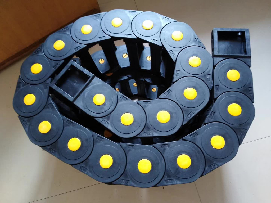 (3)单元链节由左右链板和上下盖板组成,拖链每节都能打开,装拆方便,不必穿线,打开盖板后即可把电缆、油管、气管、水管等放入拖链。