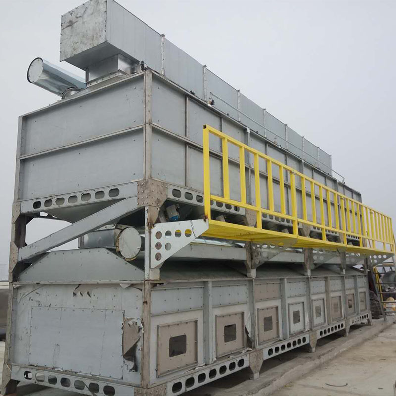 催化燃烧炉,防爆阀打开,吹新鲜空气15分钟,来清扫催化剂的脏东西。催化剂表面都有陶瓷蓄热体,能有效的续存热量,降低能耗。脱附风机加变频器 会随温度变化而自动调节风量,当箱体内温度为260 380 400度时,变频器自动调节风量,补冷风机也带有变频器。加热管开始加热,每隔2分钟加热一组,升温到200度时,脱附风机开始转动。将热气送进混流箱,混流箱配有不冷风机,作用是将混流箱的温度控制在100度以内。