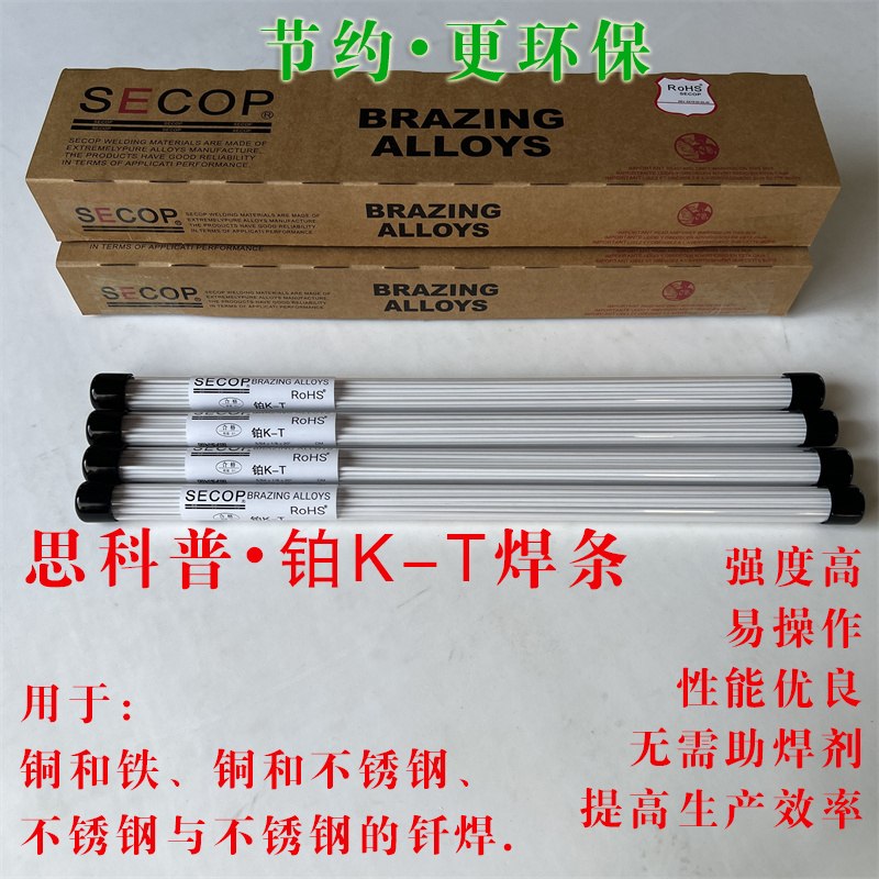 SECOP铂K-T焊条药皮钎焊材料可以帮助在钎焊施工过程中减少钎剂和钎料分开两步添加的麻烦。这样提高了效率增加了产能,另外能很大很大程度上节约钎剂,使焊接接口干净整洁。使用这种产品,生产车间更加容易实现自动化。
