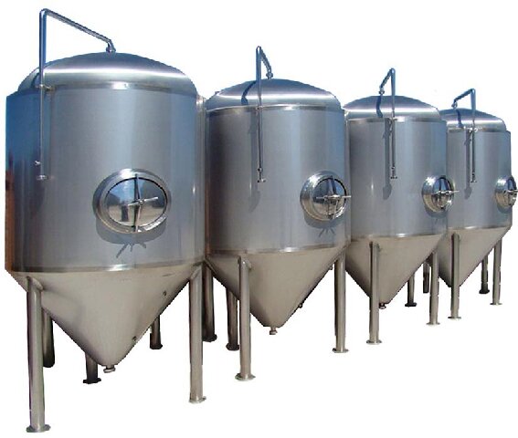 啤酒发酵罐罐体为圆柱形,顶盖为碟形,底盖为采用60°~90°倾斜度的锥形有利于罐中酒液对流强烈,发酵速度快,而且利于排放酵母和发酵罐中杂质;在酒精发酵过程中,为了回收CO2气体及其所带出的部分酒精,发酵罐宜采用密闭式。罐底部有手孔、与罐顶连接的CO2、空气、CIP等的进出管、内容物容积测量装置、空罐探头及保压装置等。