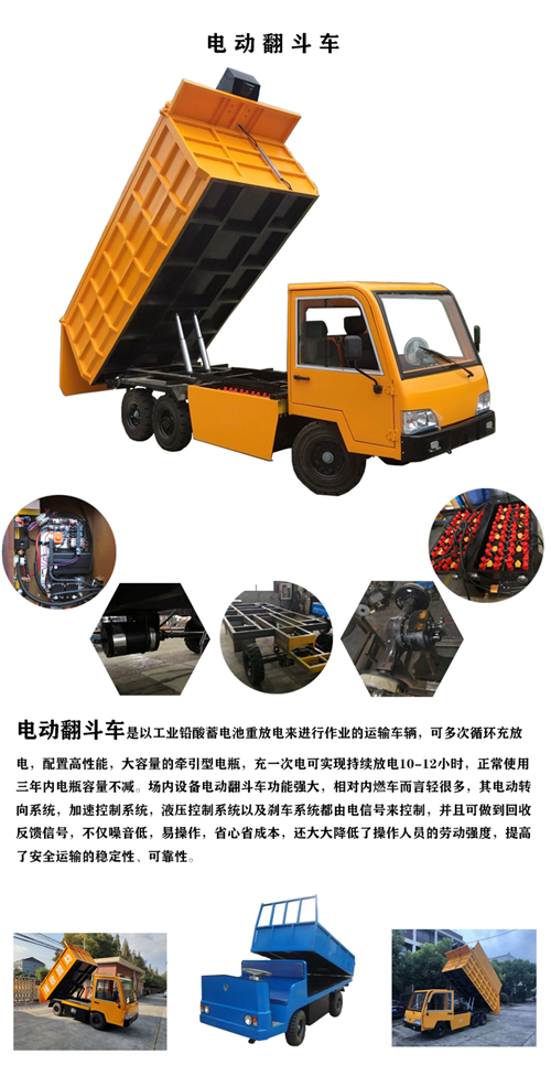 电动翻斗车是以蓄电池放电来作为车辆动力进行作业的运输车辆,配有高性能,大扭矩的牵引型电瓶,充一次电可实现持续放电10-12小时,正常放电使用三年左右。蓄电池系列电动翻斗车功能强大,相对内燃车而言轻很多,其电动或液压转向系统,加速控制系统,液压控制系统以及刹车系统都由电信号来控制,大大降低了操作人员的劳动强度,提高了安全运输的稳定性、可靠性。