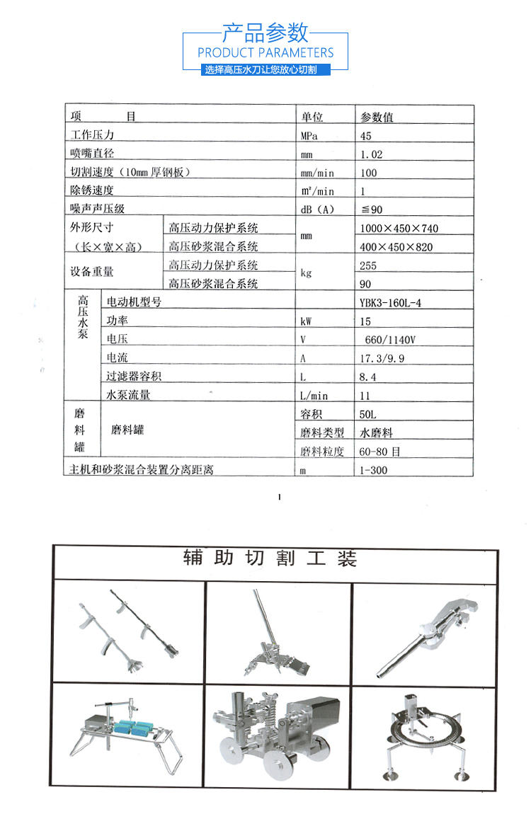注:QSM-50-15-B-BH 型水切割机,属主机系统部分,为切割作业提供高压水射流,它需要辅助切割器(如管道切割器)、高低压软管协助其完成切割作业。