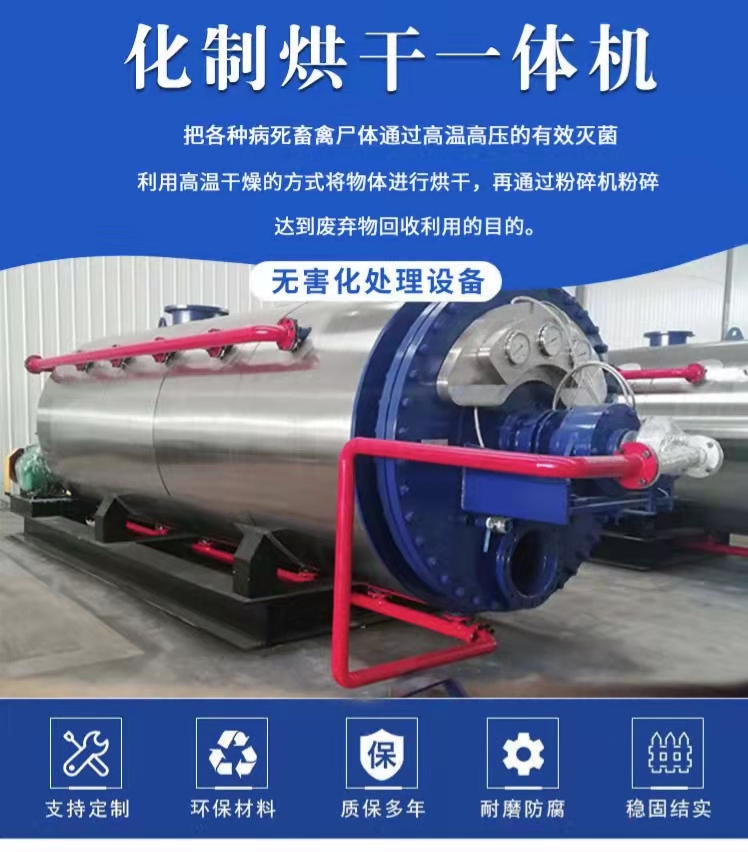 工作原理:利用高压饱和蒸汽,通过设备夹套对畜尸组织加热灭菌达到化制降解的目的。化制降解过程中蒸汽不直接与畜尸组织接触而循环于夹套中,保证了蒸汽的清洁,从而使废水的产出量大大降低,节约了废水处理成本;并且废水主要来自畜尸自身所含水分,在后续的烘干过程中也大大节省了烘干时间,较之湿化法有很大的优化提升和的效果。干化法目前在病害畜禽无害化处理放慢应用广泛,是目前先进的畜禽无害化降解处理方法。