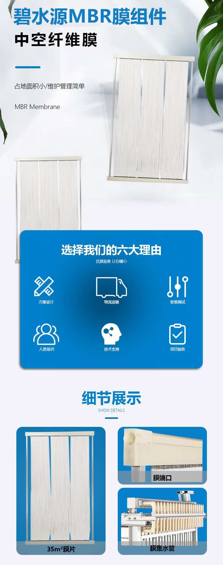 中空纤维帘式膜采用碧水源自主研发的纤维增强型微滤(RF)膜丝支撑。膜丝特有梯度网络膜孔结构,孔径分布均匀,是国*“十二五”水专项重大标志性成果,性能处于 水平,获得“北京市发明专*奖”、“中国专*奖”。