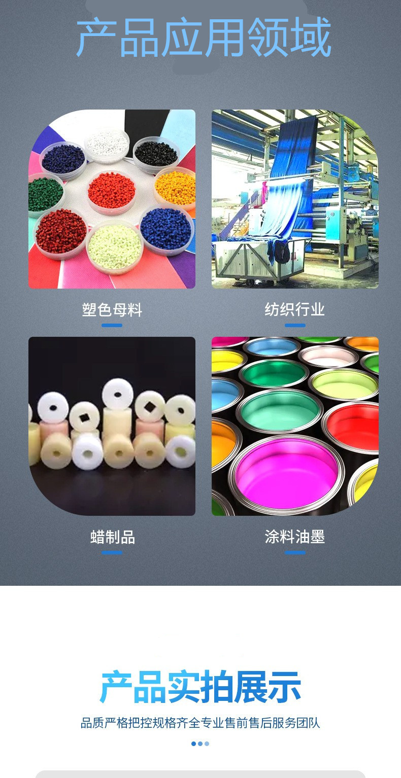 1、塑胶色母加工生产-因为该PE蜡具有优异的颜料分散功能,对于高颜料含量的PE、PP色母中的颜料有良好的润湿分散作用,广泛用作分散剂(扩散粉),提高颜料着色力。特别是对于PP化纤色母的生产,具有耐温稳定,抽丝不断丝功能。