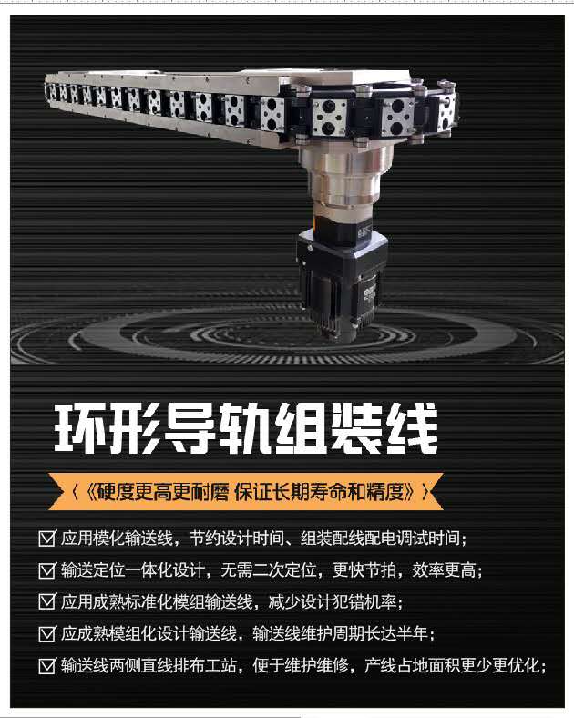 专业的柔性装配、环形导轨柔性装配生产线、柔性自动化装配线。作为一个现代化的生产工厂,总是在持续地寻找降低生产成本的方法,我们都知道,解放双手是以后的必然趋势。其中一个自动化方向是:把各个工位尽量接近地放在一起,减少工件在工位之间的移动距离,并尽量减少占地空间;要实现这一点,需要工件做环形运动,需要采用环形线。