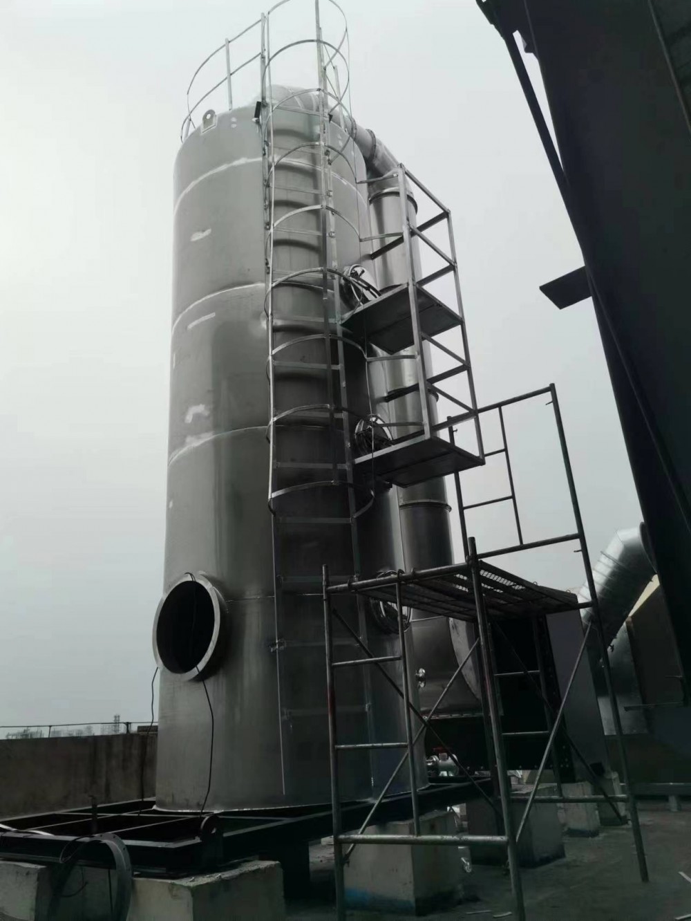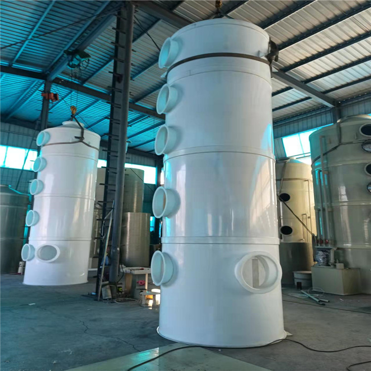 本设备分单塔体和双塔体。采用圆形塔体,用法兰分段联接而成。具体由贮液箱、塔体、进风段、喷淋层、填料层、旋流除雾层、观检窗、出风口等组成。