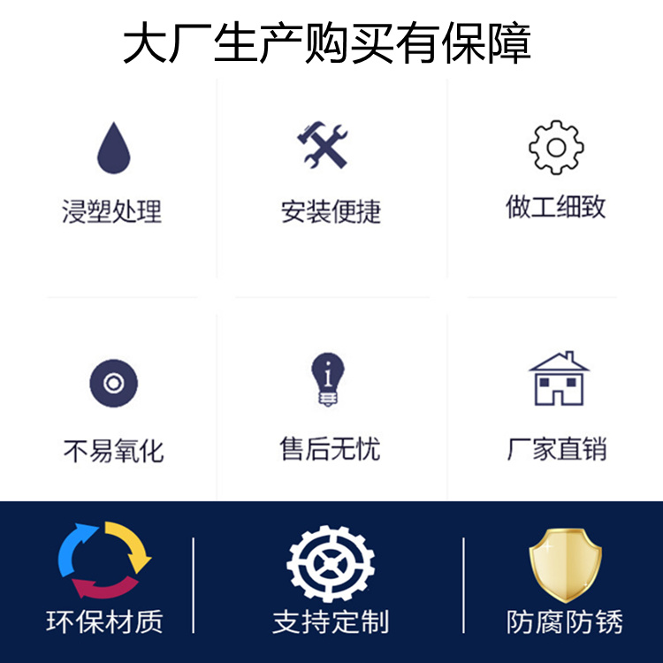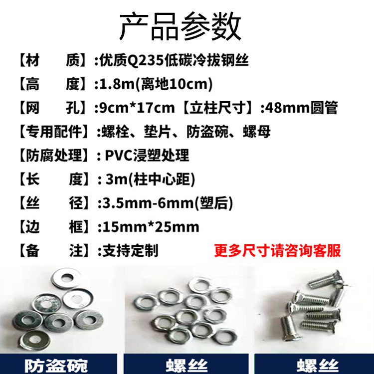 安装配件网片和立柱靠螺丝和各类的塑料或铁的卡子连接。所有的螺丝均为自动防盗的。