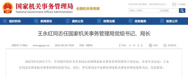 2022年6月20日下午,中央组织部有关负责同志出席国家机关事务管理局领导干部会议,宣布中央决定:王永红同志任国家机关事务管理局党组书记、局长,李宝荣同志不再担任国家机关事务管理局党组书记、局长职务。