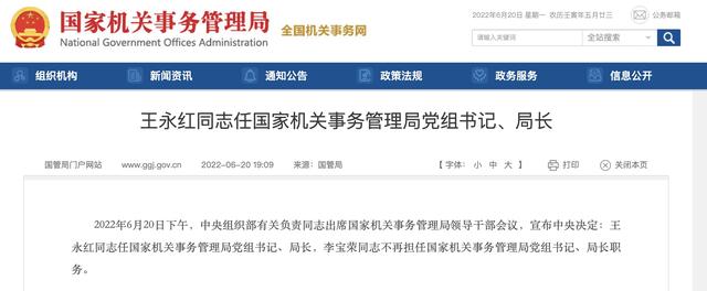 据国家机关事务管理局网站消息,2022年6月20日下午,中央组织部有关负责同志出席国家机关事务管理局领导干部会议,宣布中央决定:王永红同志任国家机关事务管理局党组书记、局长,李宝荣同志不再担任国家机关事务管理局党组书记、局长职务。
