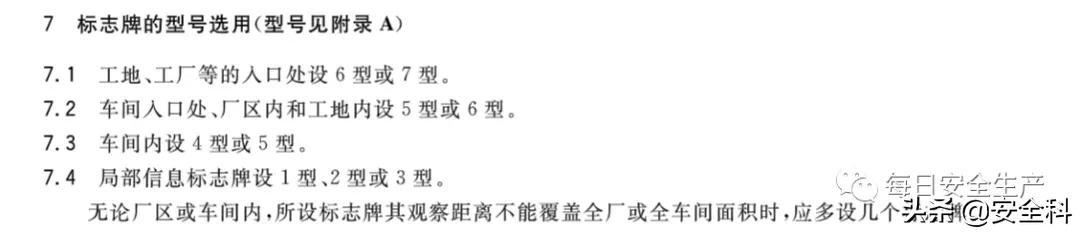 (4)危险和警告标志。危险和警告标志应设置在危险源前方足够远处,以保证观察者在首次看到标志及注意到此危险时有充足的时间,这一距离随不同情况而变化。例如,警告不要接触开关或其它电气设备的标志,应设置在它们近旁,而大厂区或运输道路上的标志,应设置于危险区域前方足够远的位置,以保证在到达危险区之前就可观察到此种警告,从而有所准备。