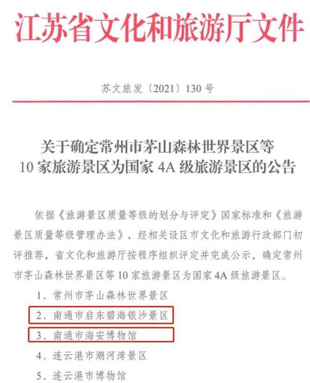 12月14日,江苏省文化和旅游厅发文公布10家国家4A级旅游景区名单,南通的碧海银沙景区、海安博物馆(韩国钧故居)位列其中。
