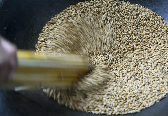 元麦炒熟散热之后,就是磨焦屑了。磨焦屑是用自家的石磨。加工场的铁磨磨焦屑虽省力,但磨巢里有生粮食残留,不容易去除,因此磨出来的焦屑会夹生。先用磨杠把上面的石磨抬起,用高粱苗子扎成的刷把,把磨塘里的生粮食刷干净,然后铺一层炒熟的元麦,再把磨盘放下来,再在磨眼上一捧一捧倒上熟元麦,转动磨盘就可以磨焦屑了。焦屑磨好后,装进密封好的釉坛里,盖好盖子,用一块塑料纸封好口,防止吸入潮气和走失香味。