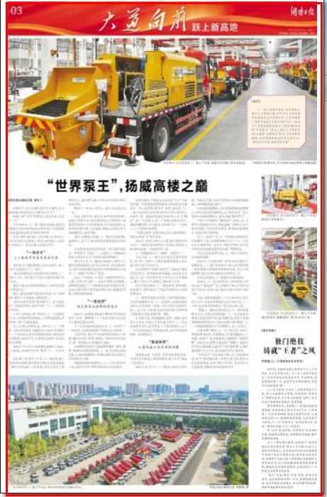 三一重工超高压拖泵,能将混凝土泵至千米高楼之巅,创下并至今保持着单泵垂直泵送的世界纪录。从深圳赛格广场泵送混凝土至高空300多米“一战成名”,到香港国际金融中心泵至406米加冕“中国泵王”,再到上海中心大厦泵至620米摘得“世界泵王”桂冠,不断刷新的高度,诠释着湖南制造的实力和自信:“建筑设计多高,就能泵送多高”。
