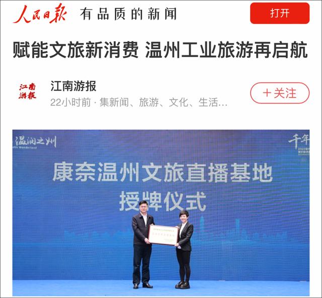 近日,人民日报客户端、新华网客户端刊发题为《赋能文旅新消费 温州工业旅游再启航》的文章,点赞我市2022温州市工业旅游嘉年华暨文旅消费季活动。