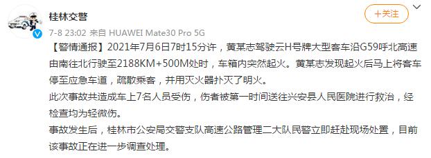 桂林交警官方微博7月8日晚发布警情通报称,2021年7月6日7时15分许,黄某志驾驶云H号牌大型客车沿G59呼北高速由南往北行驶至2188KM+500M处时,车箱内突然起火。黄某志发现起火后马上将客车停至应急车道,疏散乘客,并用灭火器扑灭了明火。
