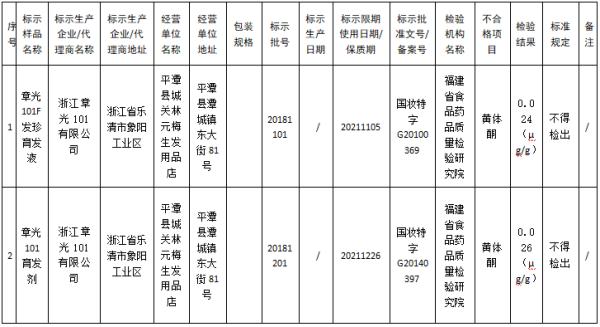 另外,浙江章光101有限公司生产的章光101育发剂黄体酮抽验不合格,检验结果为0.026(μg/g),规定为不得检出。这批不合格品的经营单位为平潭县城关林元梅生发用品店,标示批号为20181201,标示限期使用日期/保质期为20211226,标示批准文号/备案号为国妆特字G20140397,检验机构为福建省食品药品质量检验研究院。