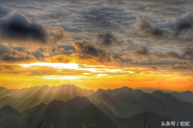 凤凰于天,一抹灿烂。远离城市的喧嚣,幕色中的海龙安静而美好。,明丽绚烂的霞光划过天际,为群山渡上一层金光。