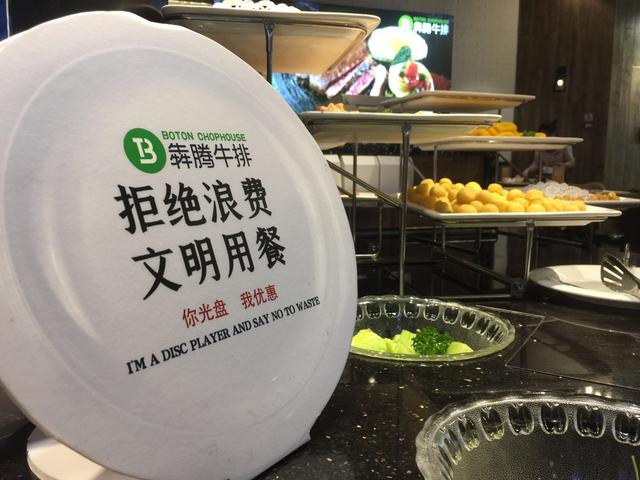 贺智慧告诉记者,为践行“光盘行动”,犇腾牛排在餐桌、墙上等地方都印上了提醒顾客“节约粮食”“浪费可耻”的宣传标语。最近,各家犇腾牛排店的自助小吃台上,还多了一个“白盘子”,这是一块KT展板,上面“拒绝浪费 文明用餐”八个大字提醒顾客将“光盘行动”进行到底。